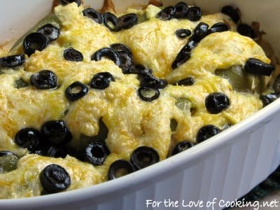 Spread the cheese mixture evenly on top of the chicken and green chiles. Top with black olives. Cover with foil.