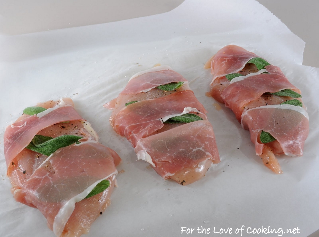 Season both sides of the flattened chicken, then place three sage leaves on each breast. Wrap two pieces of prosciutto around each chicken breast.