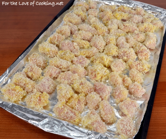 Once all the chicken has been coated, place the baking sheet into the refrigerator for 30 minutes. Side Note: This step helps the panko adhere to the chicken and prevents it from sticking to the baking sheet when flipping the chicken bites during cooking.