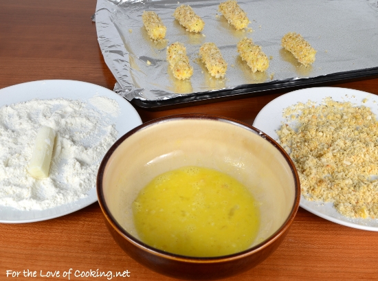 Cut the cheese sticks in half, place them in a ziplock bag, and put them into the freezer for a few hours. Side Note: They need to be frozen so the cheese doesn’t ooze out while the panko browns in the oven.