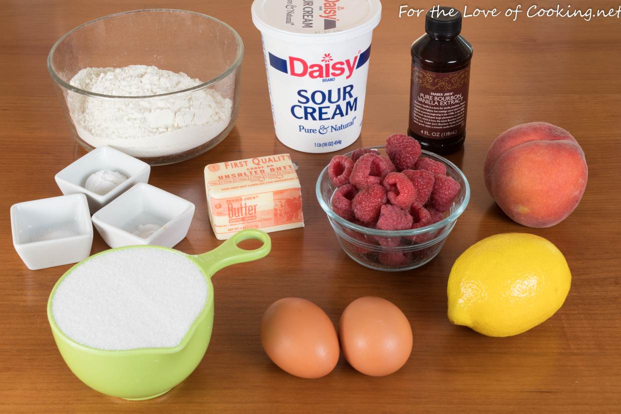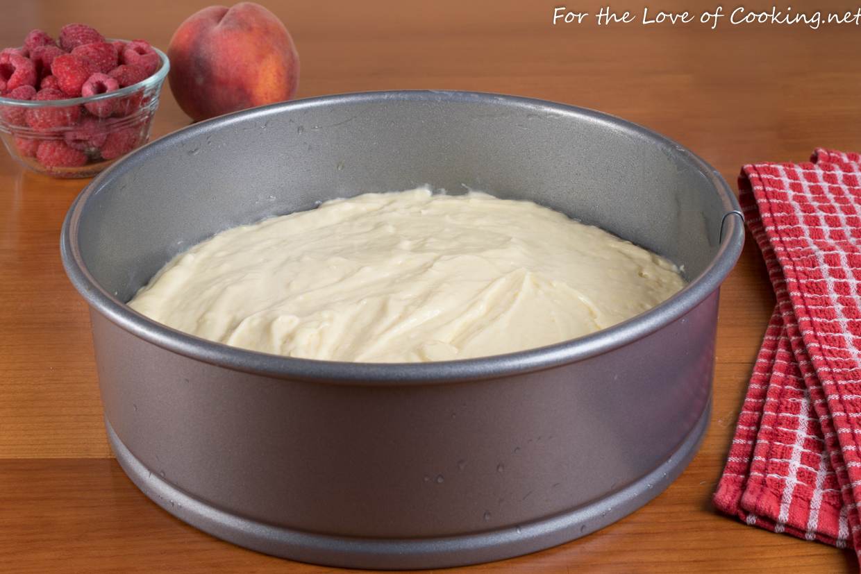 Prepare the topping by combining the peeled peach slices, raspberries, sugar, and flour in a bowl; toss to coat evenly.