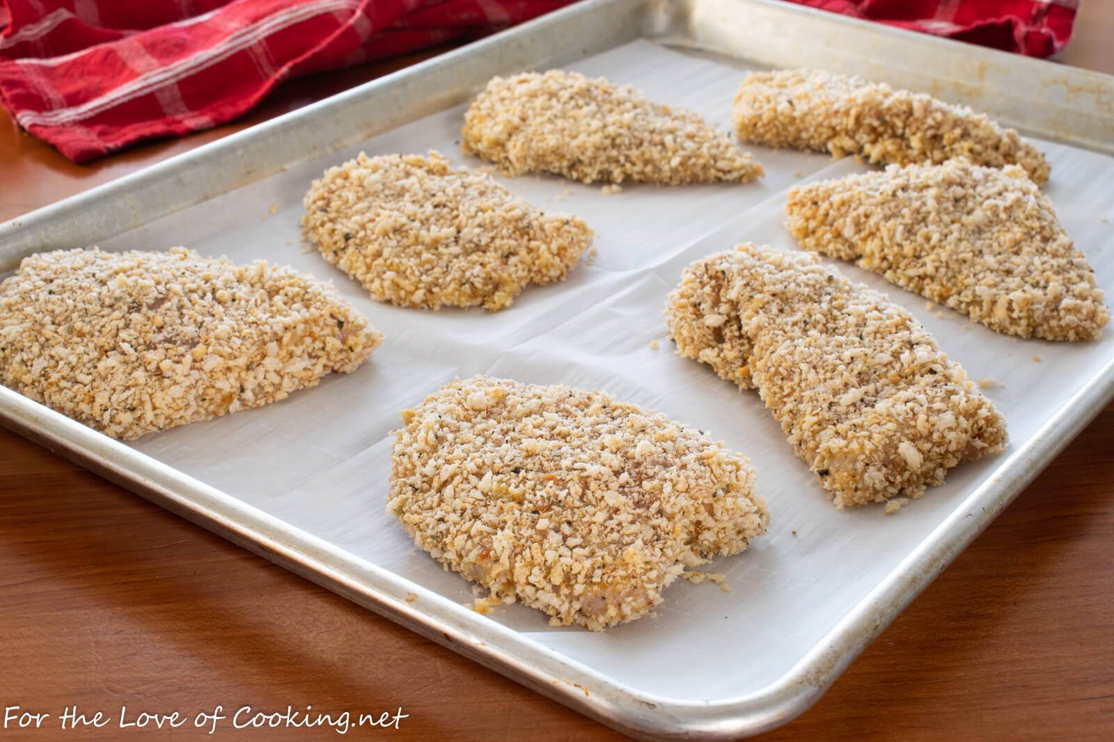 - Place the plate in the refrigerator for 30 minutes. Side Note: Don’t skip this step because it helps the breading stay adhered to the chicken.Preheat the oven to 400 degrees. Line a baking sheet with parchment paper.
